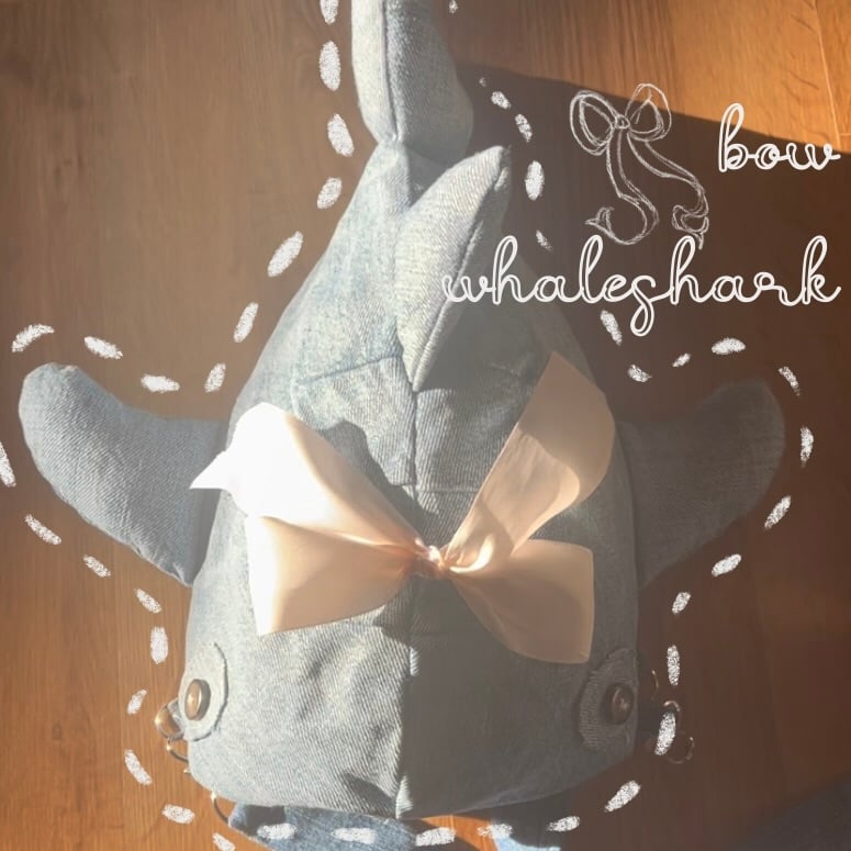 Light jean wash with subtle light pink thread for the eyes and white, thick ribbon bow Inner jean pocket some mistakes but aren't seen when worn